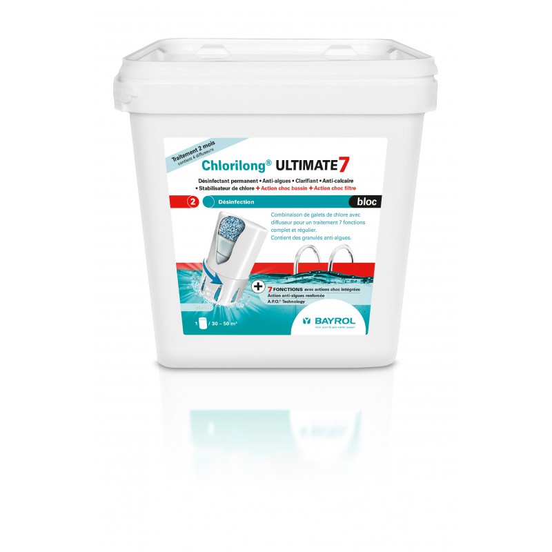 Le Chlorilong Ultimate 7 se présente sous la forme de Bloc de galets de 950 gr (ou de diffuseur) composés de chlore multifonctions.