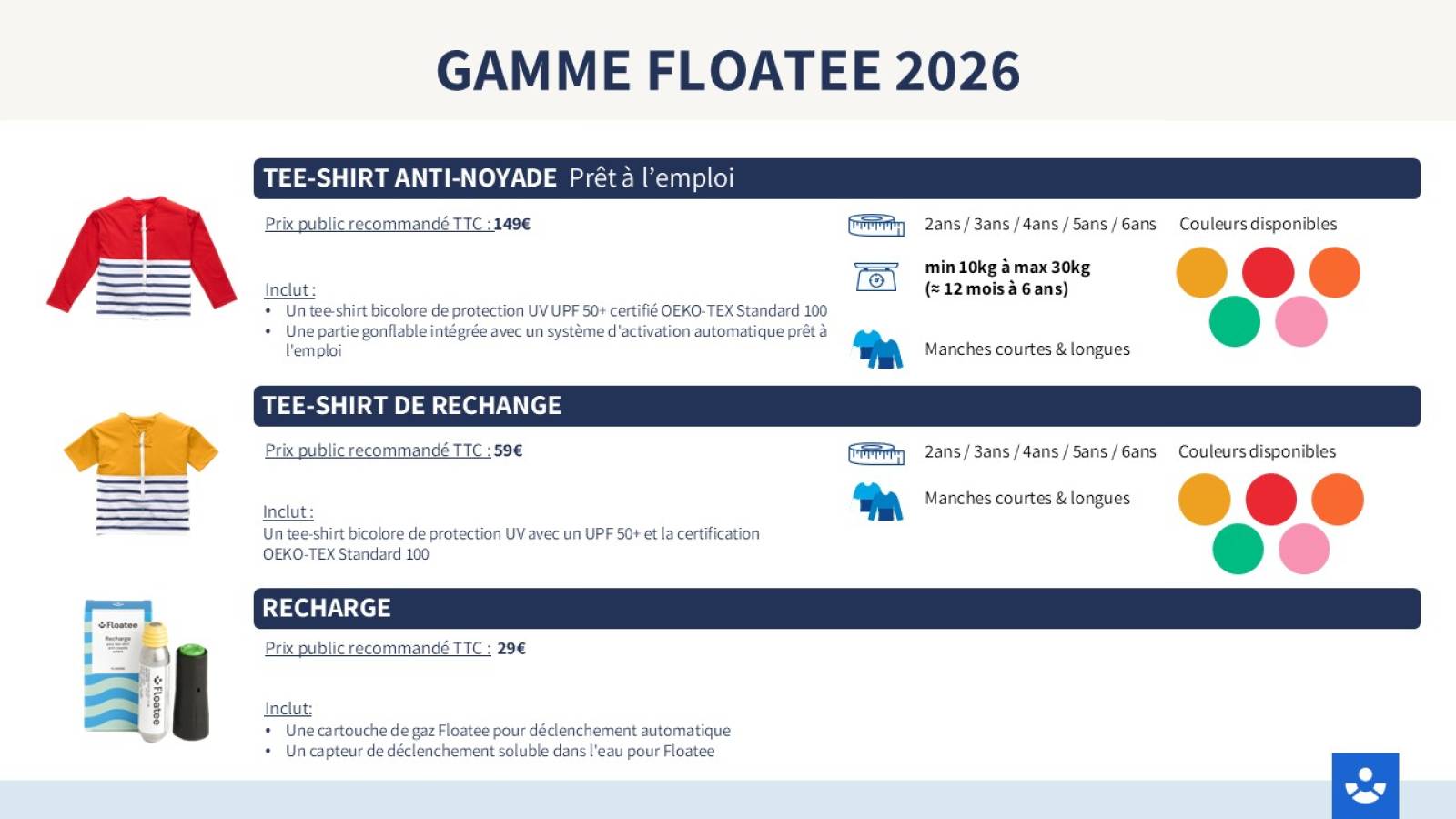 Le tee-shirt anti-noyade floatee existe en 5 coloris et avec des tailles pouvant être portées entre 1 et 6 ans !