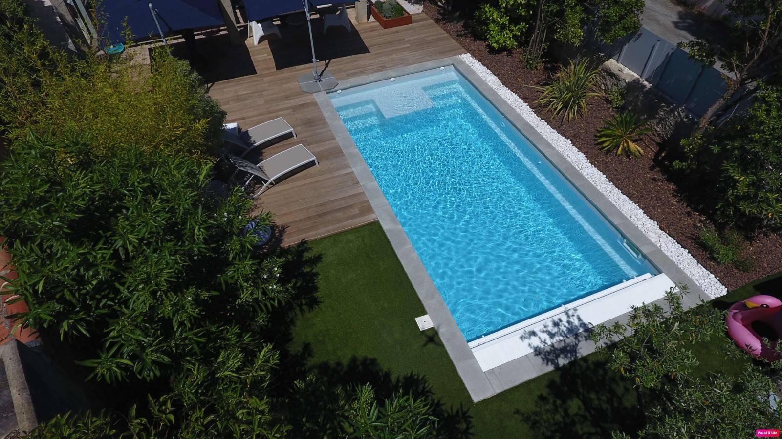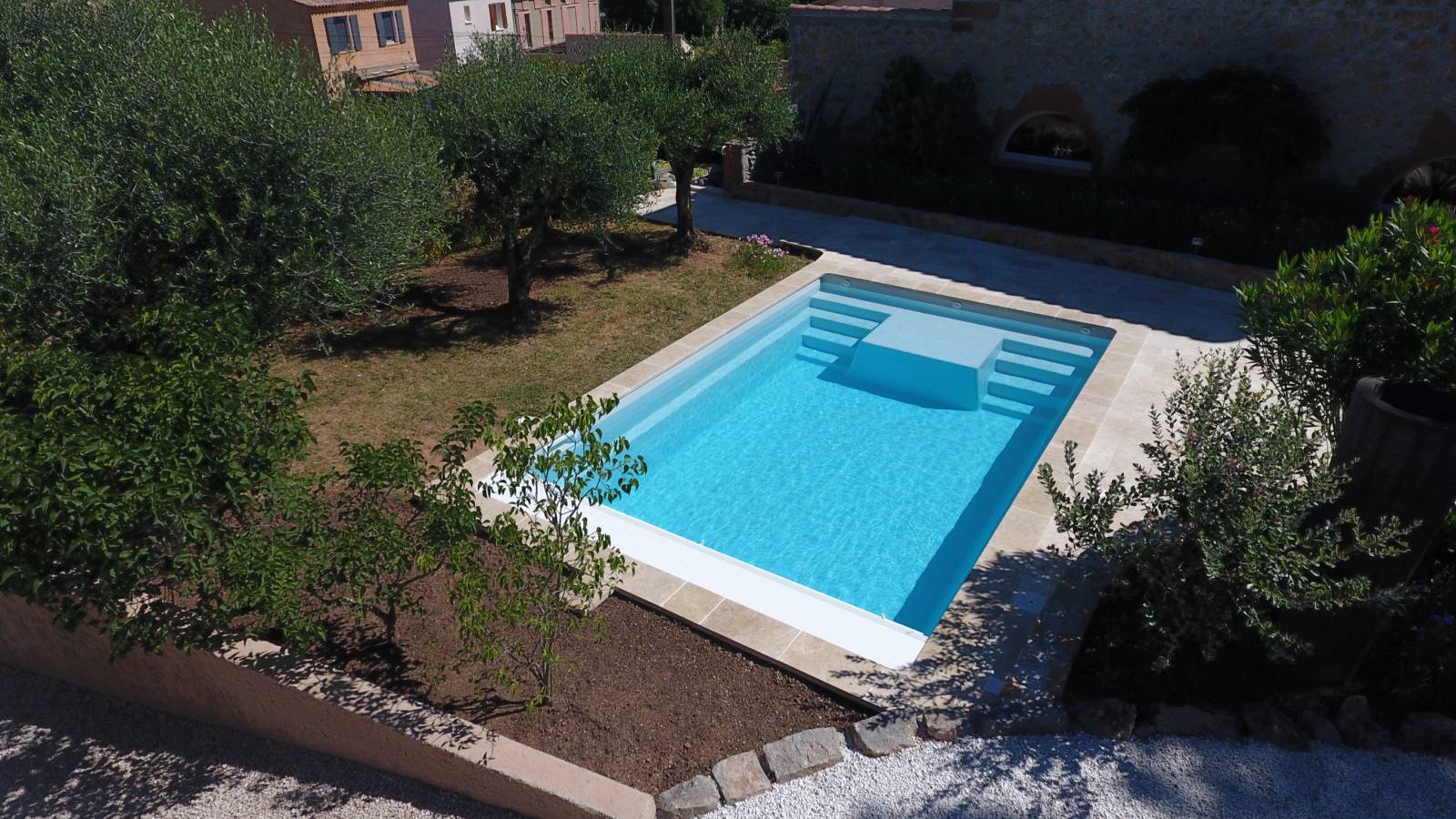L'accès au bassin se fait par l'un des deux larges escalier idéalement disposés de part et d'autre de la banquette de bronzage.