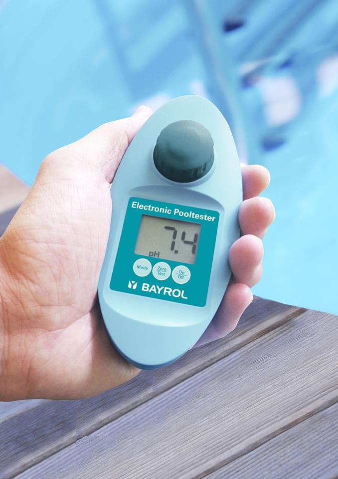 Zoom sur le Pooltester Electronic - Le Pooltester Electronic BAYROL vous permet de contrôler facilement 6 paramètres essentiels dont le Chlore et le Brome. La lecture des résultats est instantanée, parfaitement fiable et précise. Il vous suffit de remplir l’éprouvette intégrée en immergeant l’appareil dans votre bassin, puis d‘y ajouter un réactif. La couleur obtenue, suite à la réaction du produit avec l’eau, est mesurée selon le principe de la photométrie. La valeur du paramètre analysé s‘affiche sur l‘écran digital en quelques secondes. En un geste, vous pourrez contrôler : - La valeur du pH - La teneur en brome - La teneur en chlore libre - Le chlore total - Le T.A.C - Le taux de stabilisant