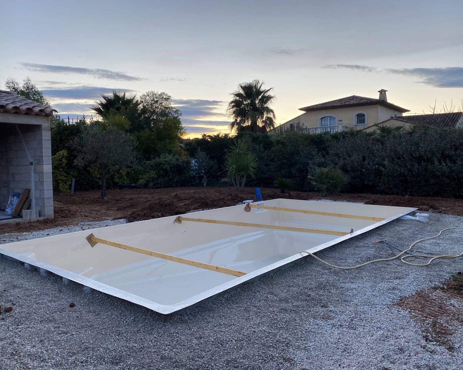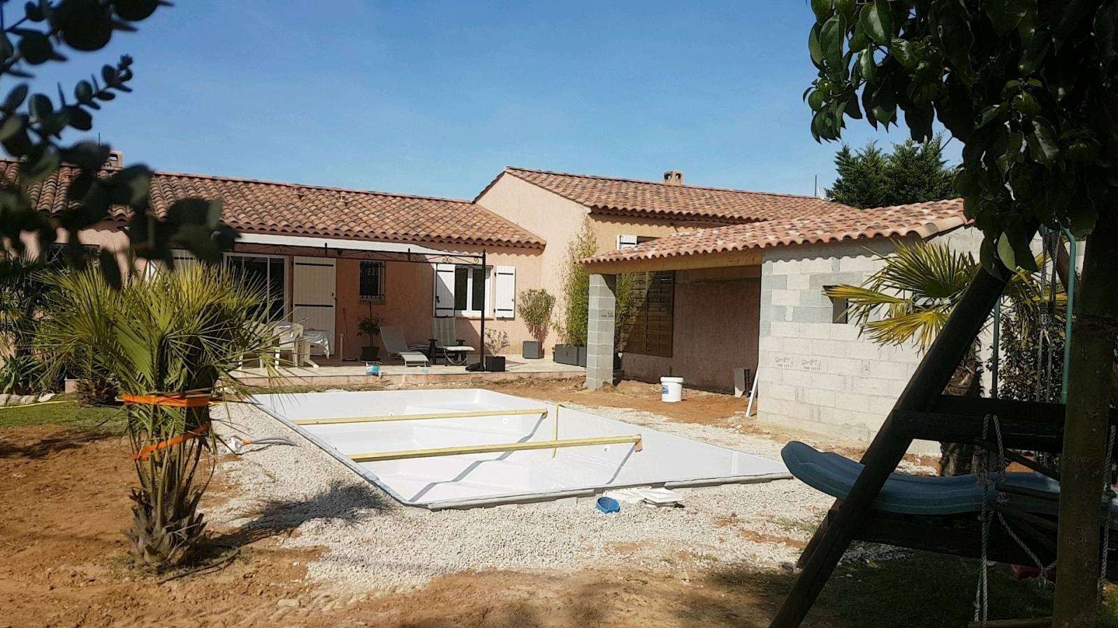 La mise en place des remblais commence par le positionnement de madriers de la taille de largeur de la piscine pour éviter de rentrer les parois lors du remblaiement. Pour le calage des quatre angles déverser du gravier concassé doucement (sous peine de faire bouger la piscine sur le radier) dans les angles du grand bain sur le 1/3 de la hauteur. Effectuer la même opération dans les angles du petit bain. Il est préconisé d'utiliser un matériel de remblaiement léger (type mini-chargeur) afin de préserver la stabilité de la structure de la piscine. Pour les fonds plats déverser le gravier dans les angles diagonales opposés.