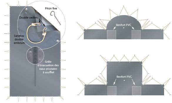 La finition périmétrique est faite par ourlet. Chaque point d'ancrage possède un double œillet, ces derniers étant espacés tous les 80 cm. Au niveau des découpes telles que pour les escaliers, des renforts ont été placés.