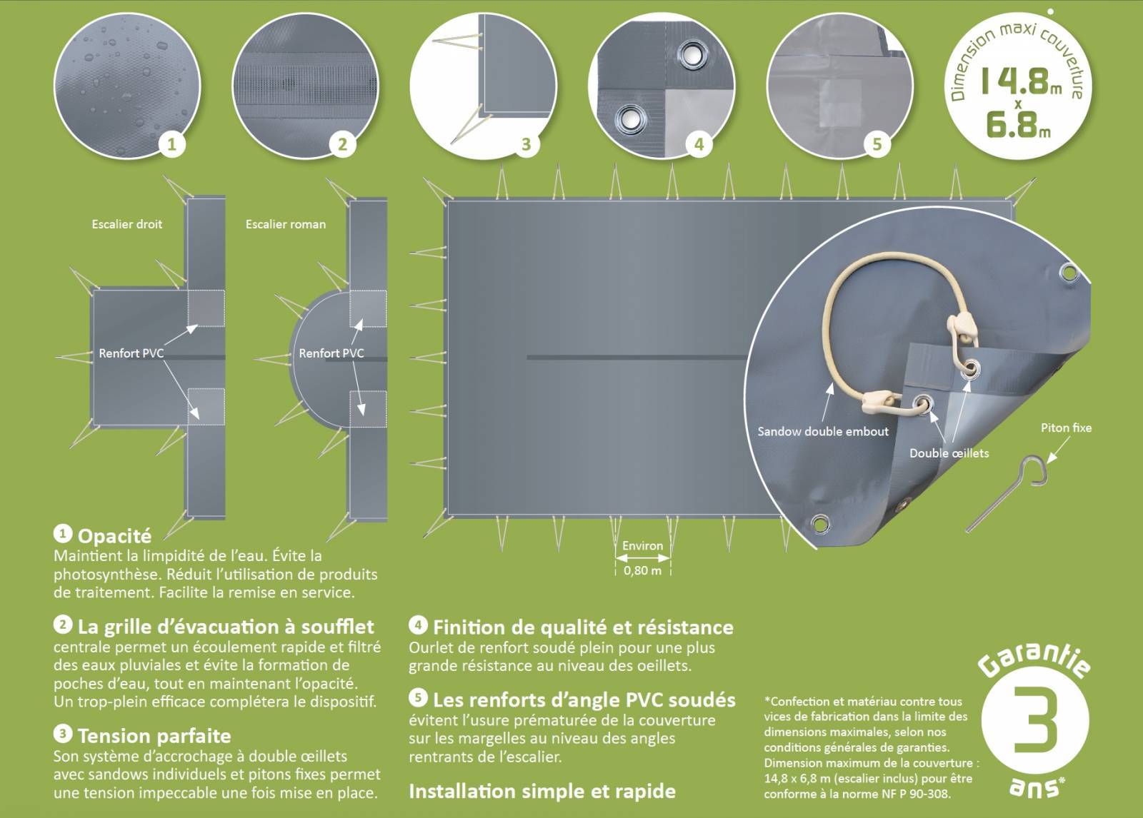La couverture d'hivernage convient à tout type de bassins enterrés, compatible avec de nombreuses formes ( rectangulaires, parallélogramme, ronde, ovale) la dimension maximale compatible est 14.8 x 6.8 m. Le bassin doit faire au maximum 90 m².